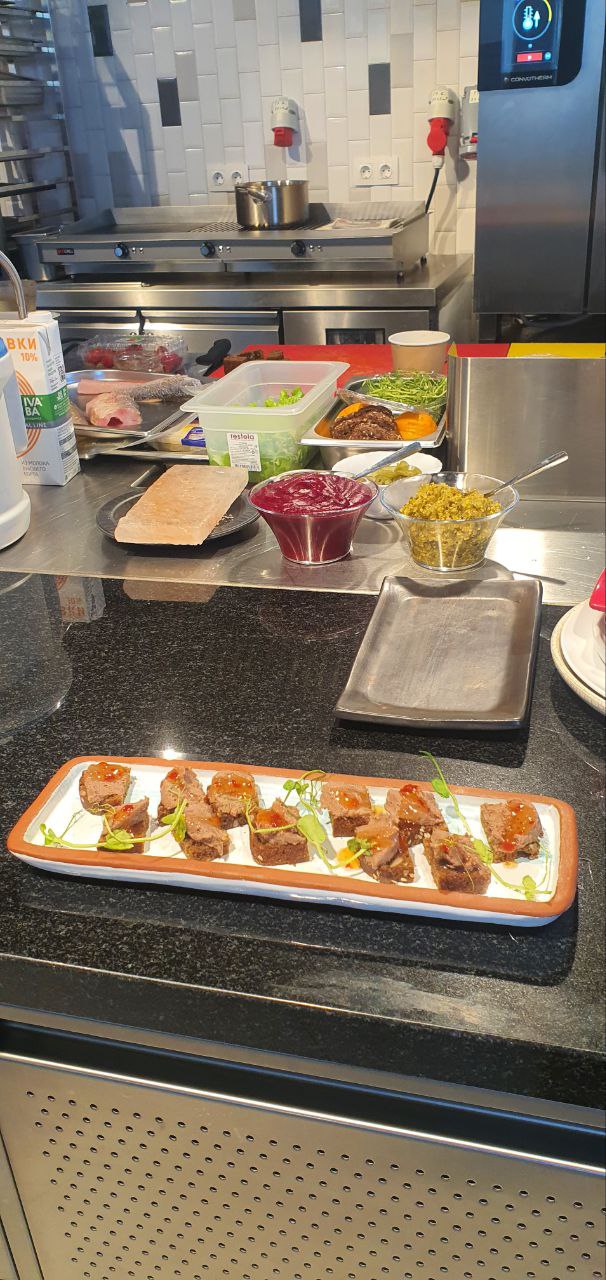 Наш шеф приготовил окорок, корейку и шею медведя. А так же дикую семгу, муксуна, сига и экзотический трюфель! Всё это в нескольких вариантах подачи и приготовления!