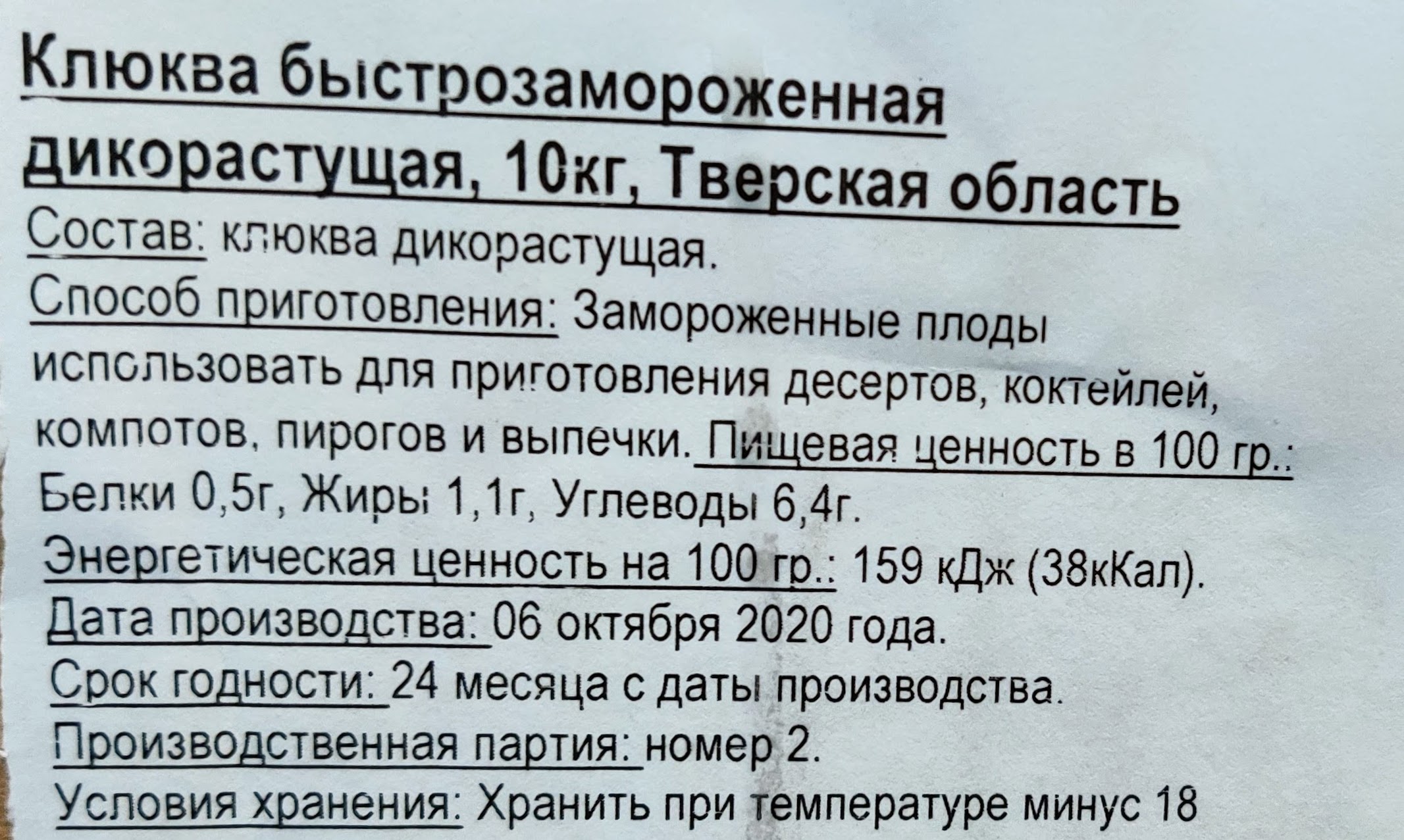 Приобрести дикую клюкву можно для приготовления различных десертов, напитков (морсов, настоек), соусов, добавления в качестве пикантного ингредиента в соленья, салаты и блюда из мяса. В этой ягоде содержится большое количество полезных веществ: йод, железо, марганец, бор. Поэтому не удивительно, что медики относят ее к одному из самых полезных для организма продуктов питания. Помимо полезных свойств, клюква обладает необычным вкусом с небольшой кислинкой. Хранится ягода может продолжительное время без потери своих товарных, целебных и вкусовых качеств.